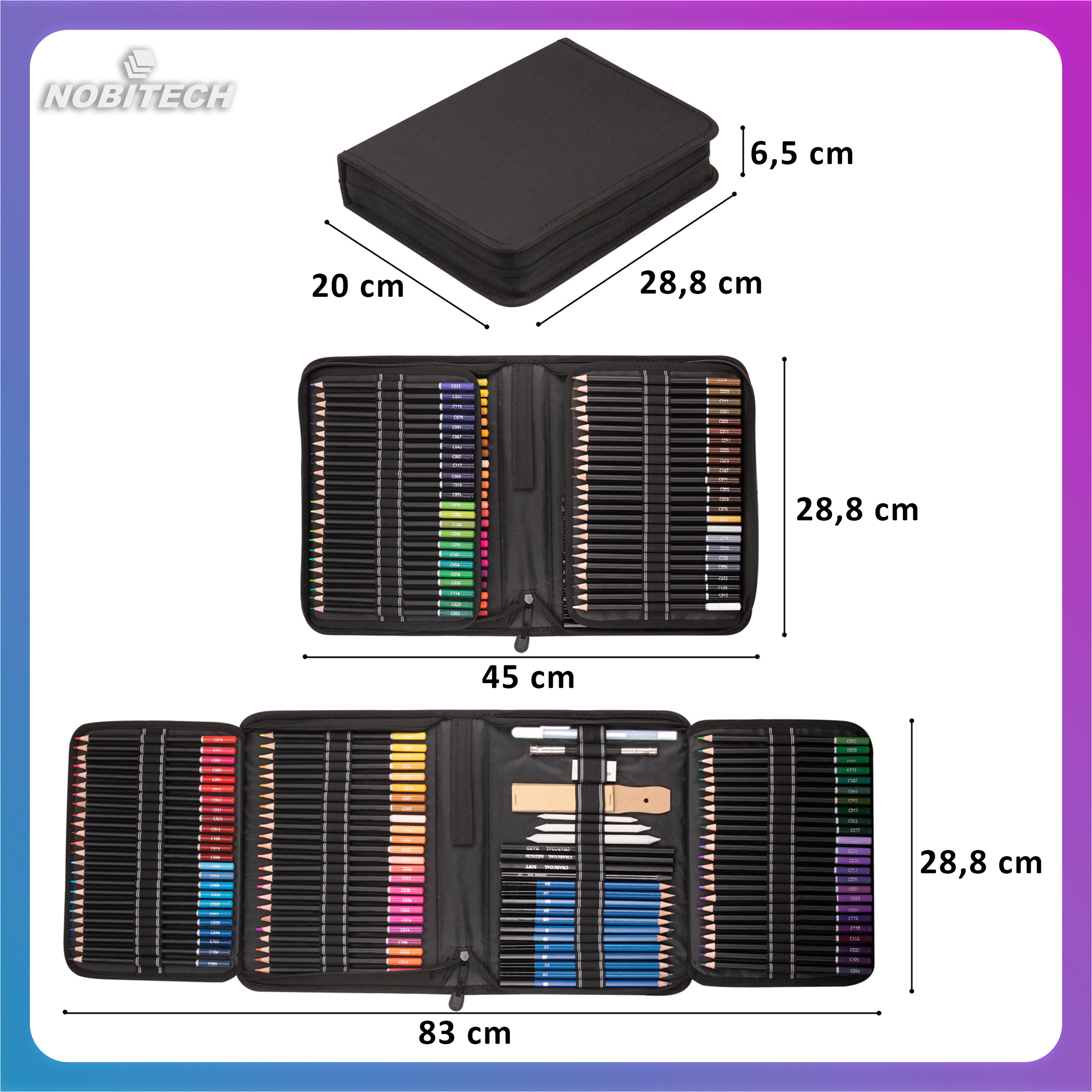 Zestaw artystyczny z elementami niezbędnymi do profesjonalnego szkicowania oraz rysowania został umieszczony w poręcznym etui, które pełni również funkcję organizera. Elastyczne i wytrzymałe gumki przytwierdzone do materiału pozwalają na wygodne wyciąganie, a także odkładanie akcesoriów na miejsce. Piórnik jest rozkładany, posiada dwie ruchome klapki, na których z każdej strony poukładane są w kolorowej kolejności kredki.